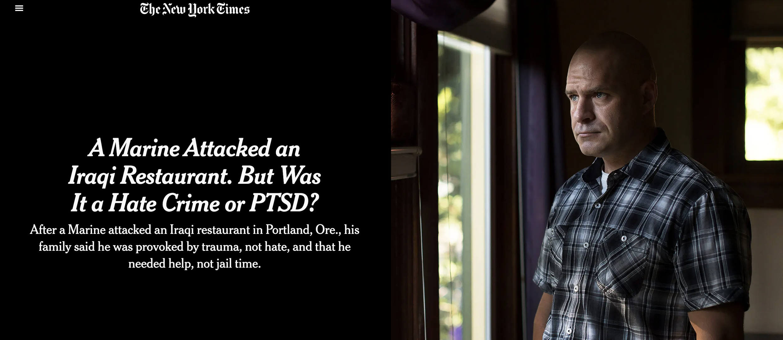 On October 18, 2017, reporter Dave Philipps published a front-page story in the New York Times: "A Marine Attacked an Iraqi Restaurant. But Was It a Hate Crime or PTSD?" It's a more careful piece than the original Portland coverage — it gives Rodriguez's combat history a full hearing, it raises the veterans court exclusion, and it quotes Ghaith's nuanced grief alongside Rodriguez's anguish.