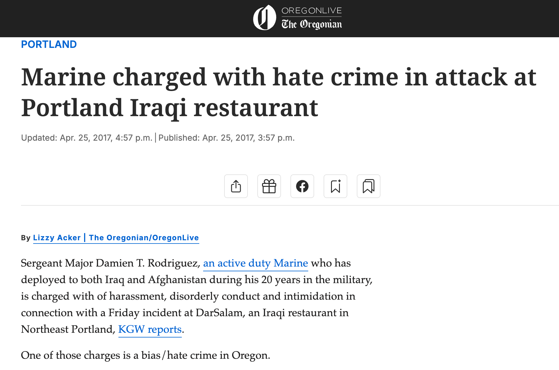 The Oregonian's story was archived by the Wayback Machine on April 25, 2017, indicating it was live before 2:00 PM that day. KATU's segment — which included footage from what appears to have been a press conference outside DarSalam — didn't air until 6:18 PM. So either SGT Simpson used "hate crime" language independently when he briefed Lizzy Acker that morning, or the press conference happened before 2:00 PM and Acker had already been there or been briefed on it. Either way, the record is clear that Simpson told Acker ORS 166.155 was "a bias/hate crime law in Oregon." It is not, and he is a professional law enforcement officer who is obligated to know the difference.