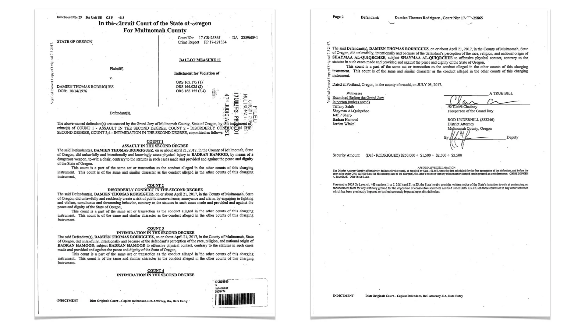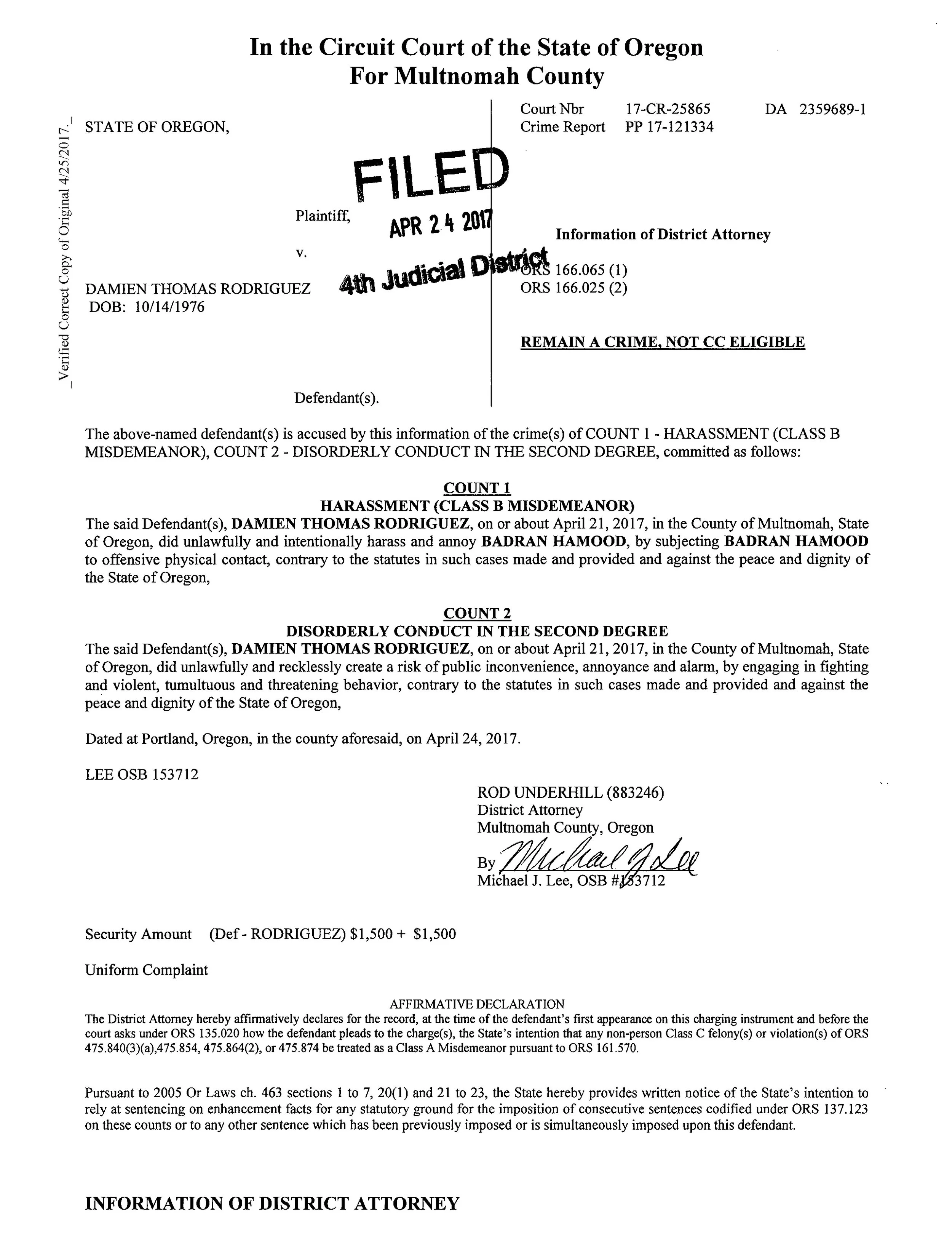 On April 24, 2017, a Multnomah County District Attorney filed an Information charging Rodriguez with Harassment (Class B Misdemeanor) and Disorderly Conduct in the Second Degree. Those are the charges the facts of the incident supported.