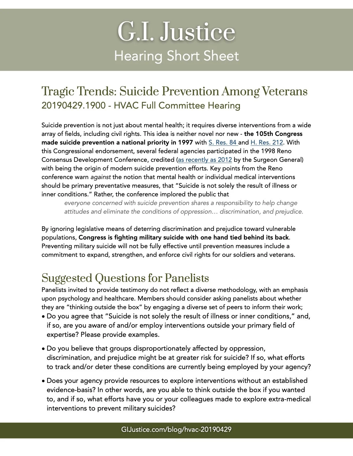 By ignoring legislative means of deterring discrimination and prejudice toward vulnerable populations, Congress is fighting military suicide with one hand tied behind its back. Preventing military suicide will not be fully effective until prevention measures include a commitment to expand, strengthen, and enforce civil rights for our soldiers and veterans.