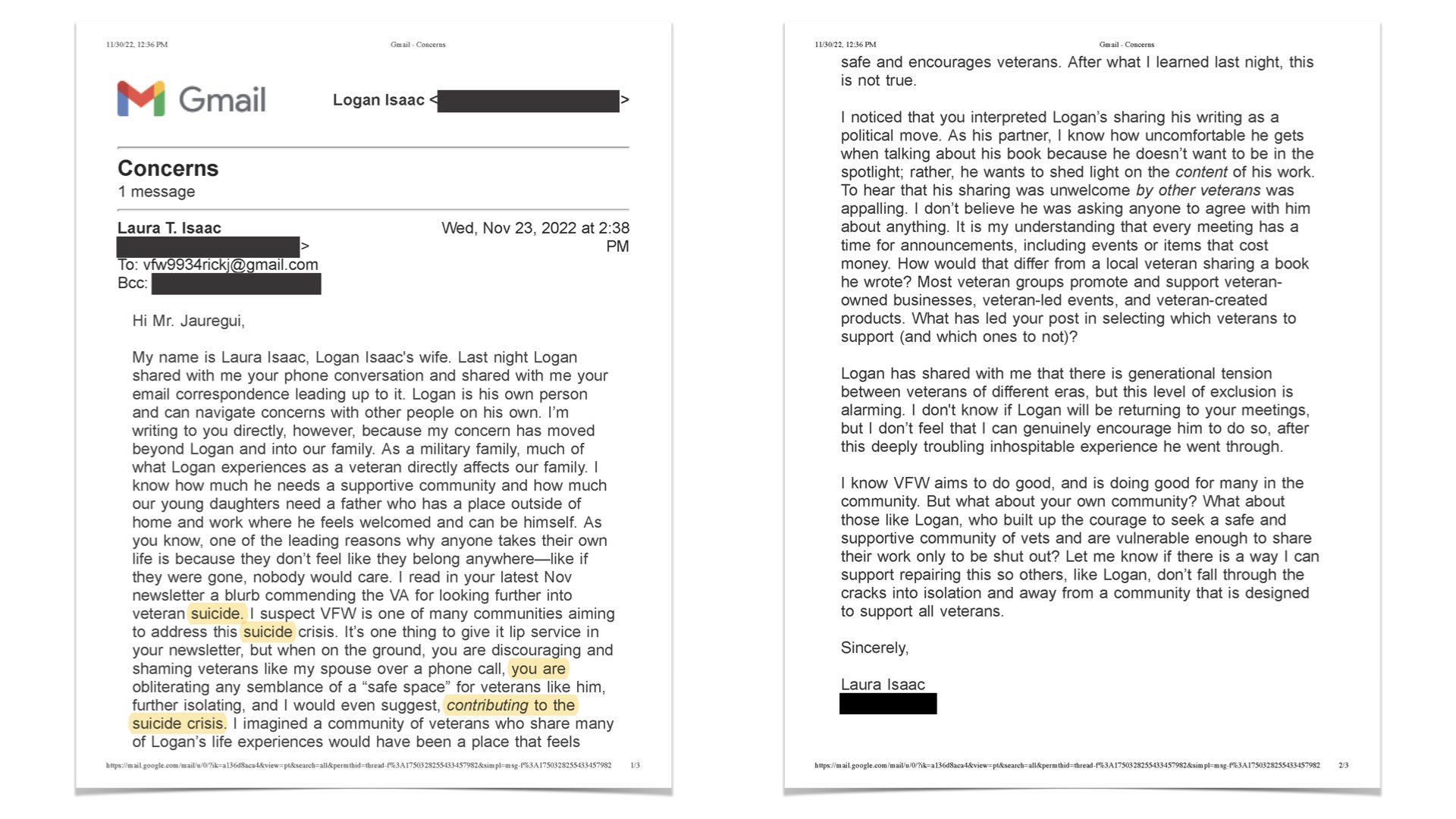 Laura's email to VFW Post 9934 Commander Rick Jauregui