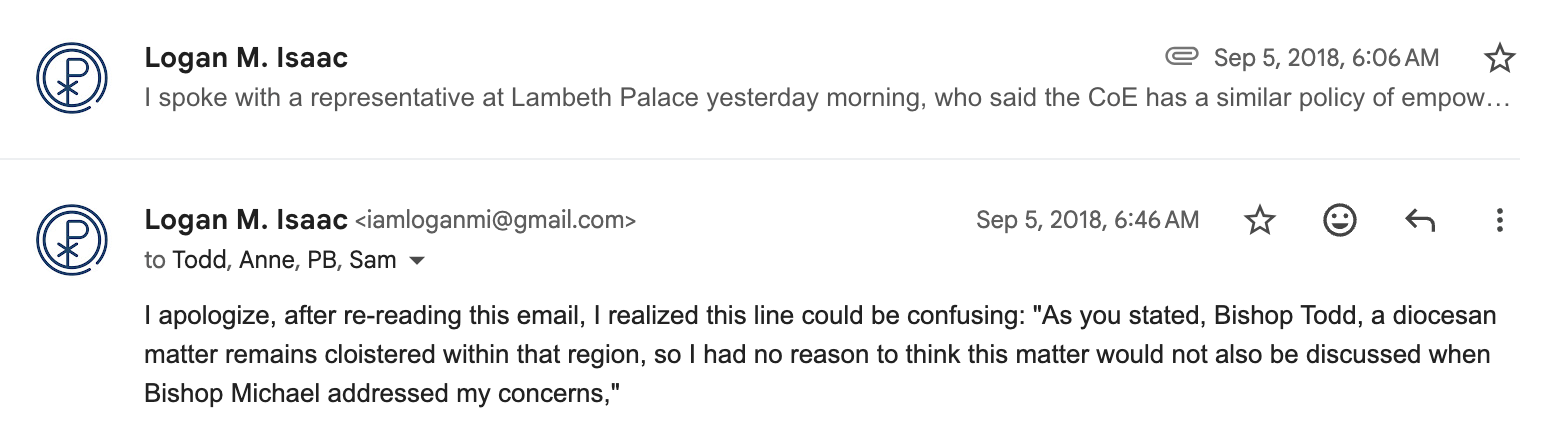 I apologize, after re-reading this email, I realized this line could be confusing: "As you stated, Bishop Todd, a diocesan matter remains cloistered within that region, so I had no reason to think this matter would not also be discussed when Bishop Michael addressed my concerns,"