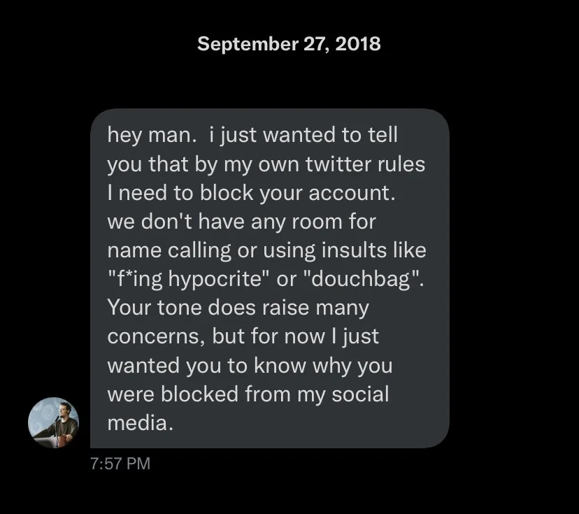 Shane: hey man. i just wanted to tell you that by my own twitter rules i need to block your account. we don’t have any room for name calling or using insults like “f*ing hypocrite” or “douchebag”. your tone does raise many concerns but for now i just wanted you to know why you were blocked from my social media.