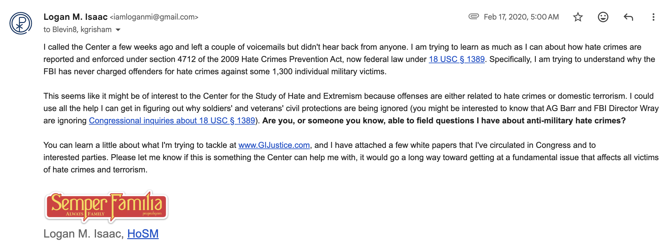 This seems like it might be of interest to the Center for the Study of Hate and Extremism because offenses are either related to hate crimes or domestic terrorism. I could use all the help I can get in figuring out why soldiers' and veterans' civil protections are being ignored (you might be interested to know that AG Barr and FBI Director Wray are ignoring Congressional inquiries about 18 USC ยง 1389). Are you, or someone you know, able to field questions I have about anti-military hate crimes?