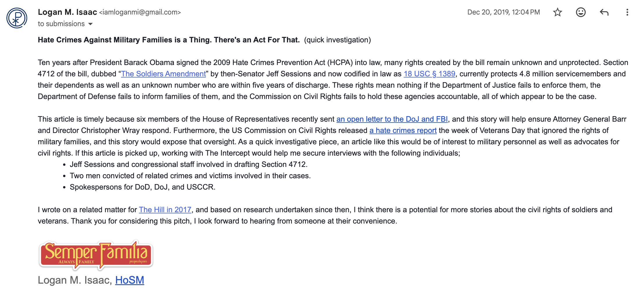 This article is timely because six members of the House of Representatives recently sent an open letter to the DoJ and FBI, and this story will help ensure Attorney General Barr and Director Christopher Wray respond. Furthermore, the US Commission on Civil Rights released a hate crimes report the week of Veterans Day that ignored the rights of military families, and this story would expose that oversight. As a quick investigative piece, an article like this would be of interest to military personnel as well as advocates for civil rights. If this article is picked up, working with The Intercept would help me secure interviews with the following individuals;