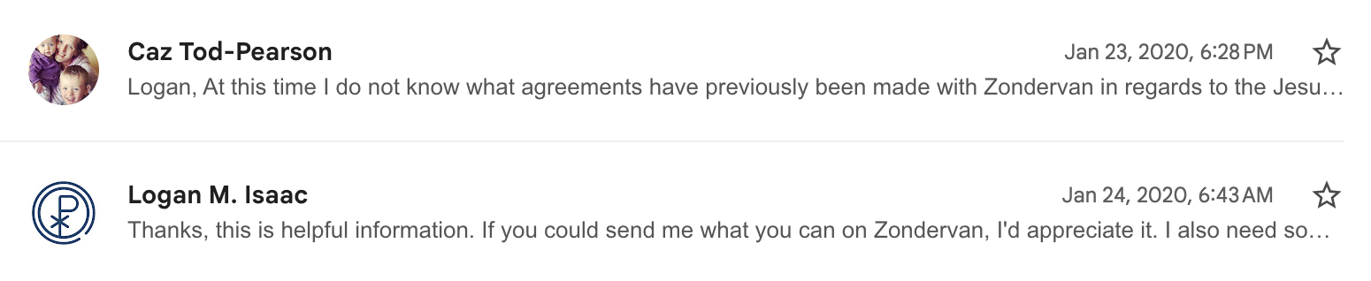 I also need someone to reach out to [redacted] and ask him to share a copy of the audio and video with TSW or with me. I'm particularly interested in either making sure that it is made free, including to me, or to stop using it to earn revenue. I'd be happy to get information on any agreement made with him, since I never dealt with him directly, but that is actually a higher priority for me than the Zondervan thing.