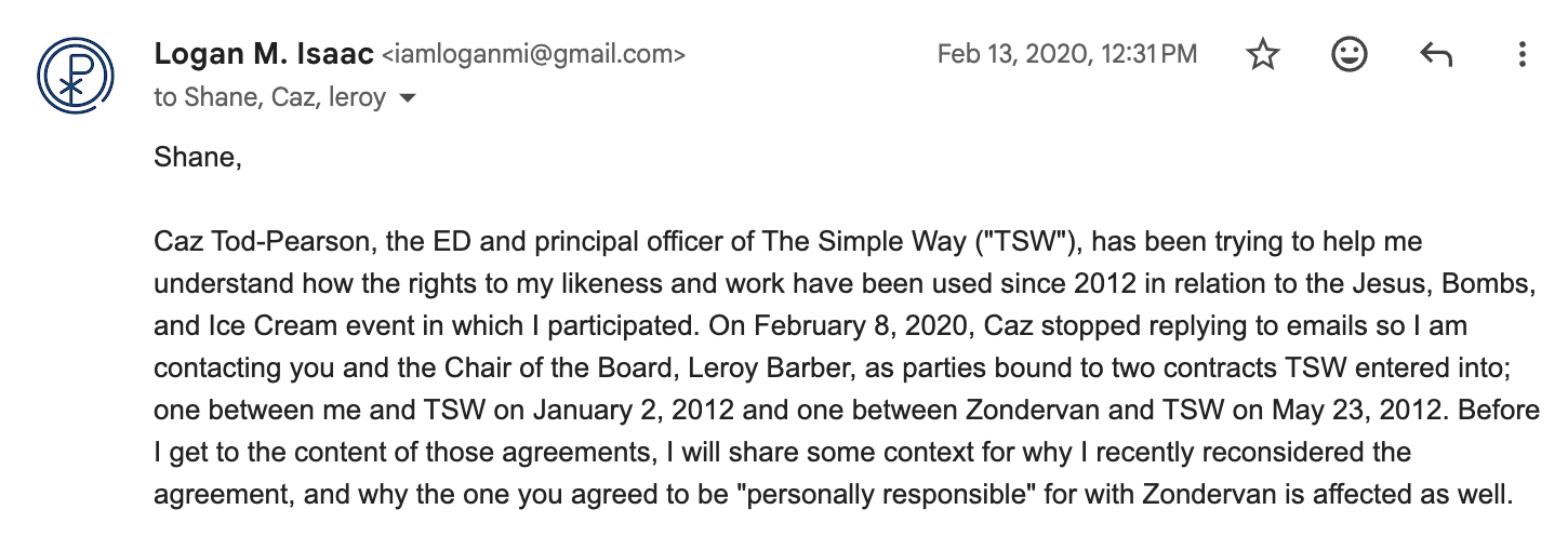 Caz Tod-Pearson, the ED and principal officer of The Simple Way ("TSW"), has been trying to help me understand how the rights to my likeness and work have been used since 2012 in relation to the Jesus, Bombs, and Ice Cream event in which I participated. On February 8, 2020, Caz stopped replying to emails so I am contacting you and the Chair of the Board, Leroy Barber, as parties bound to two contracts TSW entered into; one between me and TSW on January 2, 2012 and one between Zondervan and TSW on May 23, 2012. Before I get to the content of those agreements, I will share some context for why I recently reconsidered the agreement, and why the one you agreed to be "personally responsible" for with Zondervan is affected as well.