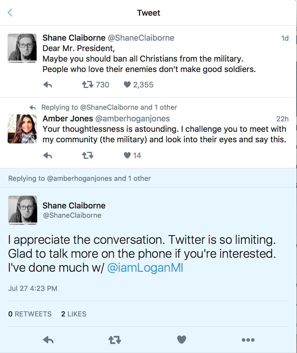 Following the 2018 events centered around the RLC “revival” and December gathering, I have lost any trust in you and the organizations you promote to treat my peers and me with the human dignity we deserve. For example, after a mainstage speaker stated that “fallen soldiers are victims, not heroes,” Tony Campolo had to publicly address the “negative spin that was given to people in the military.” This is just one example of how my community has been demeaned by yours, but the beginning of the end was months later, during and after my visit to your house for the "Windows on the World" lecture I gave at Eastern University. It did not come out until later that you misrepresented your intentions. You were not offering your home to an old friend, you and Don Golden were apparently sizing me up to see if I would submit to being policed for behavior that Don failed to establish ever happened.
