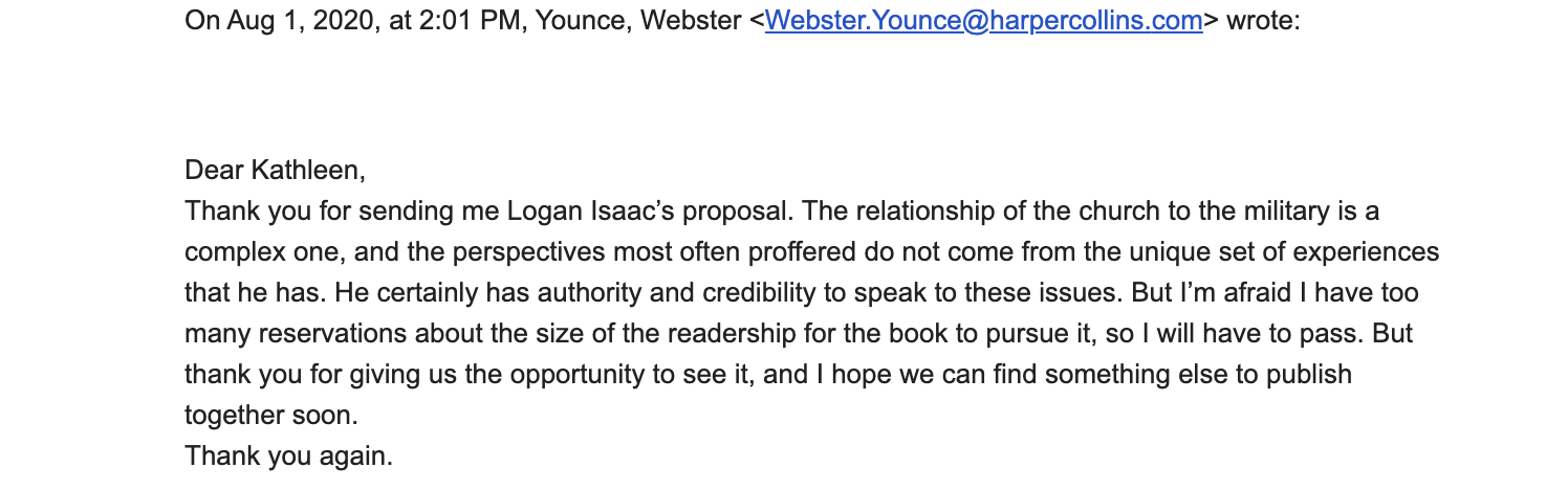 Thank you for sending me Logan Isaac’s proposal. The relationship of the church to the military is a complex one, and the perspectives most often proffered do not come from the unique set of experiences that he has. He certainly has authority and credibility to speak to these issues. But I’m afraid I have too many reservations about the size of the readership for the book to pursue it, so I will have to pass. But thank you for giving us the opportunity to see it, and I hope we can find something else to publish together soon.