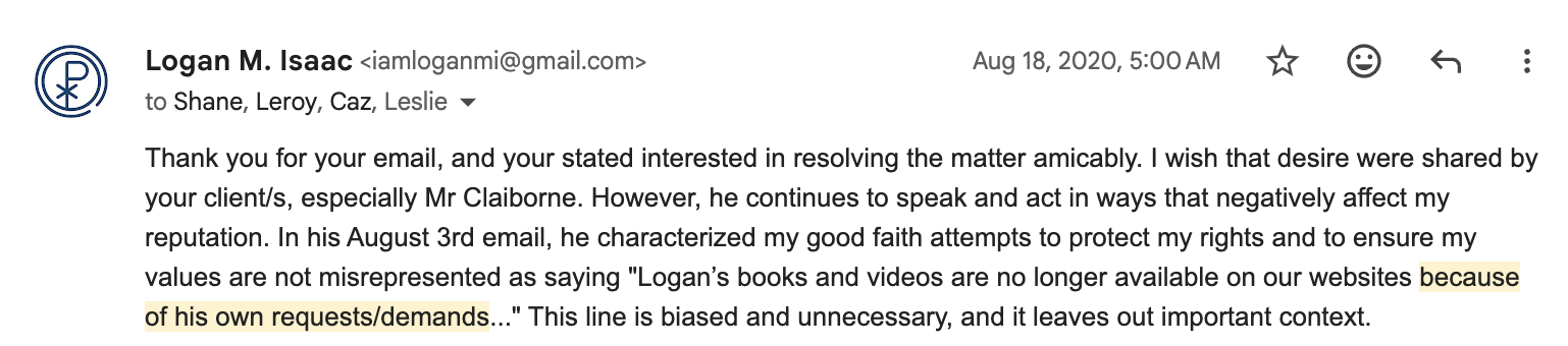 Thank you for your email, and your stated interested in resolving the matter amicably. I wish that desire were shared by your client/s, especially Mr Claiborne. However, he continues to speak and act in ways that negatively affect my reputation. In his August 3rd email, he characterized my good faith attempts to protect my rights and to ensure my values are not misrepresented as saying "Logan’s books and videos are no longer available on our websites because of his own requests/demands..." This line is biased and unnecessary, and it leaves out important context.