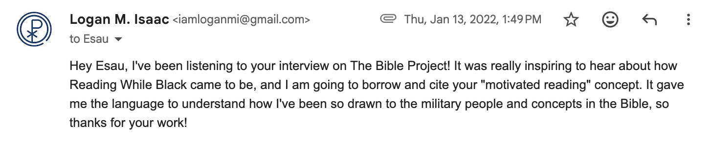 Hey Esau, I've been listening to your interview on The Bible Project! It was really inspiring to hear about how Reading While Black came to be, and I am going to borrow and cite your "motivated reading" concept. It gave me the language to understand how I've been so drawn to the military people and concepts in the Bible, so thanks for your work!