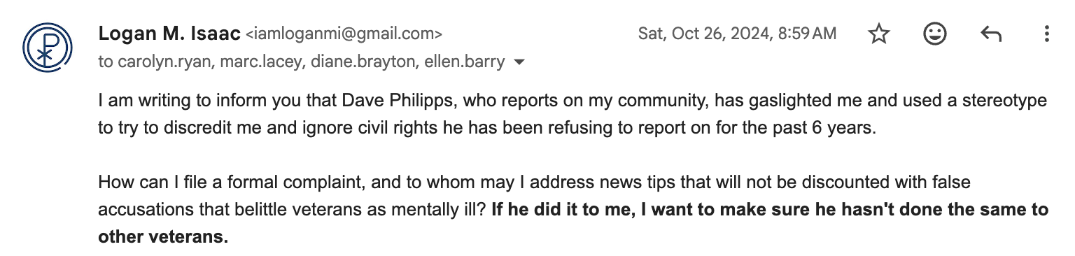 📧 “Fwd: NYTimes military reporter gaslighting veteran” (ignored)