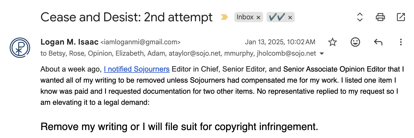 About a week ago, I notified Sojourners Editor in Chief, Senior Editor, and Senior Associate Opinion Editor that I wanted all of my writing to be removed unless Sojourners had compensated me for my work. I listed one item I know was paid and I requested documentation for two other items. No representative replied to my request so I am elevating it to a legal demand: