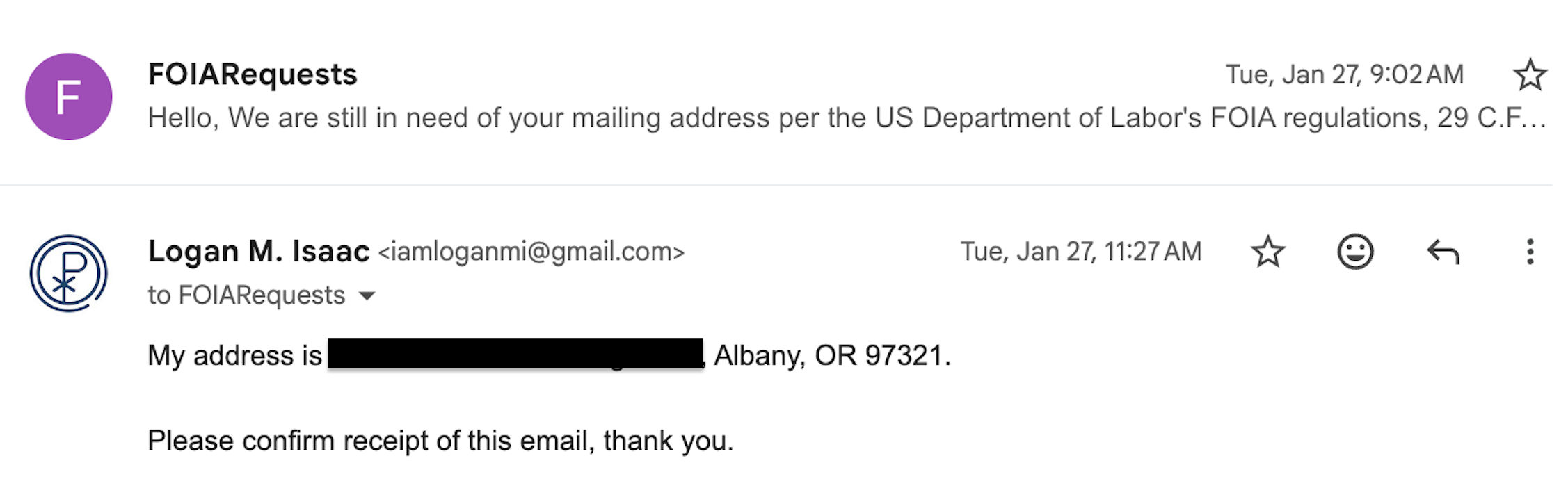 We are still in need of your mailing address per the US Department of Labor's FOIA regulations, 29 C.F.R. § 70.19(b). Please respond only through foiarequests@dol.gov or fax your response to 202-693-5389.