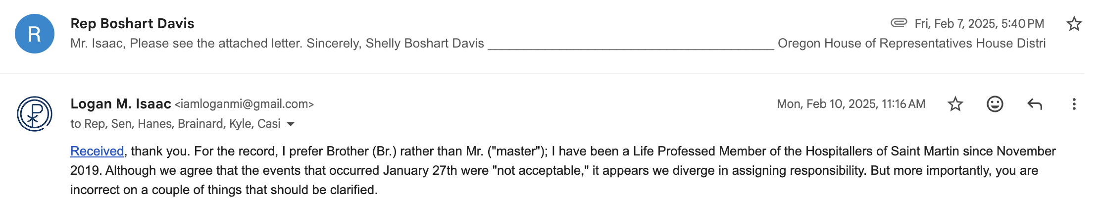 Finally, as a public office operated by the Oregon Legislative Assembly, office H-389 is public, not private, property. As such the office is not yours to apply arbitrary restraint upon the exercise of my rights.