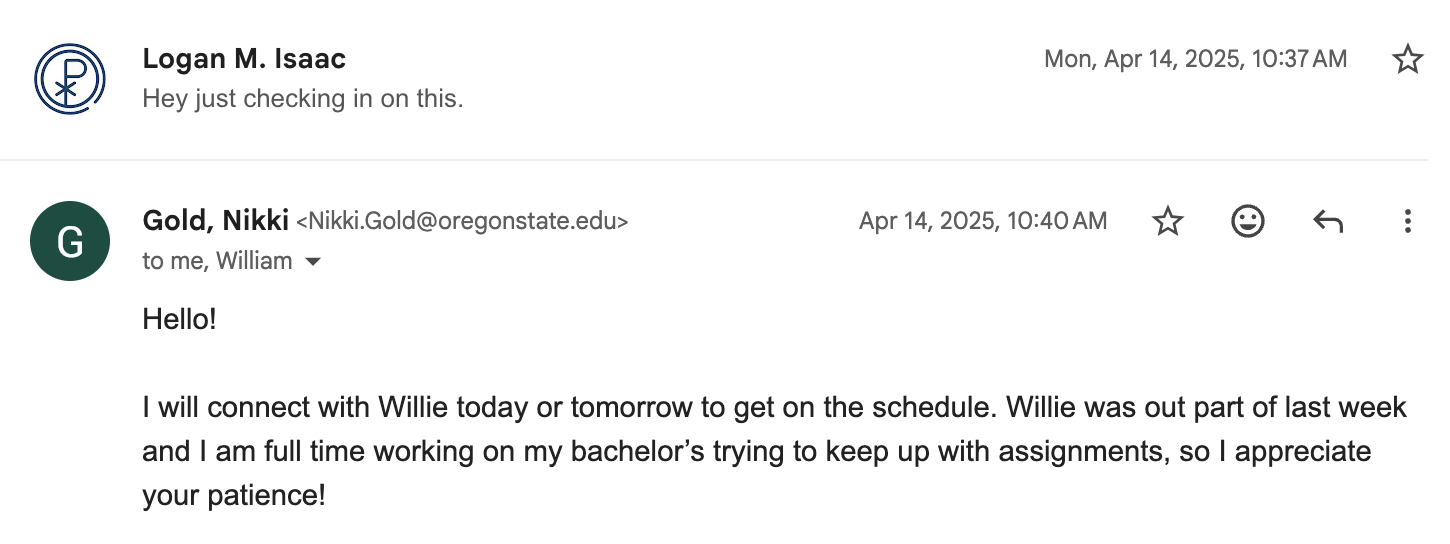 I will connect with Willie today or tomorrow to get on the schedule. Willie was out part of last week and I am full time working on my bachelor’s trying to keep up with assignments, so I appreciate your patience!