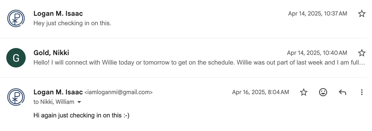 📧 “OSU Student Veterans” to Nikki Gold (ignored) OSU Student Veterans Apr 16 Written By Logan M. Isaac Hi again just checking in on this :-) Nikki GoldSVAOSUOregonWilliam Elfering Logan M. Isaac