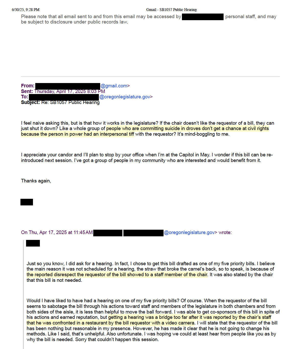 I feel naive asking this, but is that how it works in the legislature? If the chair doesn’t like the requestor of a bill, they can just shut it down? Like a whole group of people who are committing suicide in droves don’t get a chance at civil rights because the person in power had an interpersonal tiff with the requestor? It’s mind-boggling to me.