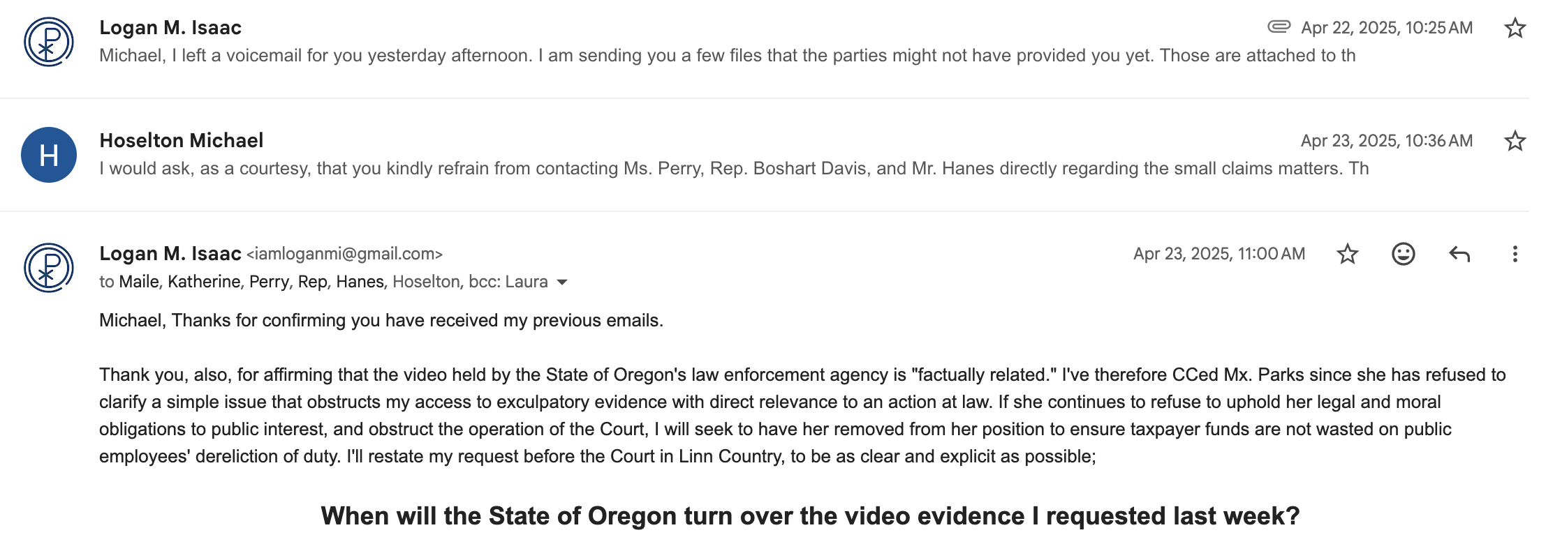Thank you, also, for affirming that the video held by the State of Oregon's law enforcement agency is "factually related." I've therefore CCed Mx. Parks since she has refused to clarify a simple issue that obstructs my access to exculpatory evidence with direct relevance to an action at law. If she continues to refuse to uphold her legal and moral obligations to public interest, and obstruct the operation of the Court, I will seek to have her removed from her position to ensure taxpayer funds are not wasted on public employees' dereliction of duty. I'll restate my request before the Court in Linn Country, to be as clear and explicit as possible;