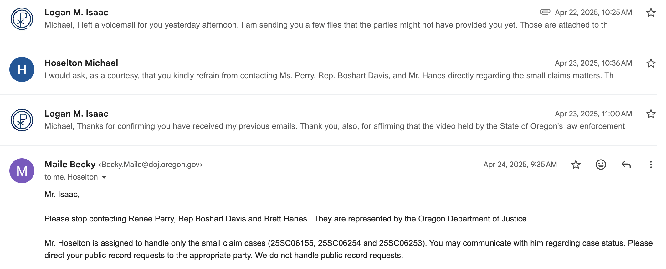 Mr. Hoselton is assigned to handle only the small claim cases (25SC06155, 25SC06254 and 25SC06253). You may communicate with him regarding case status. Please direct your public record requests to the appropriate party. We do not handle public record requests.