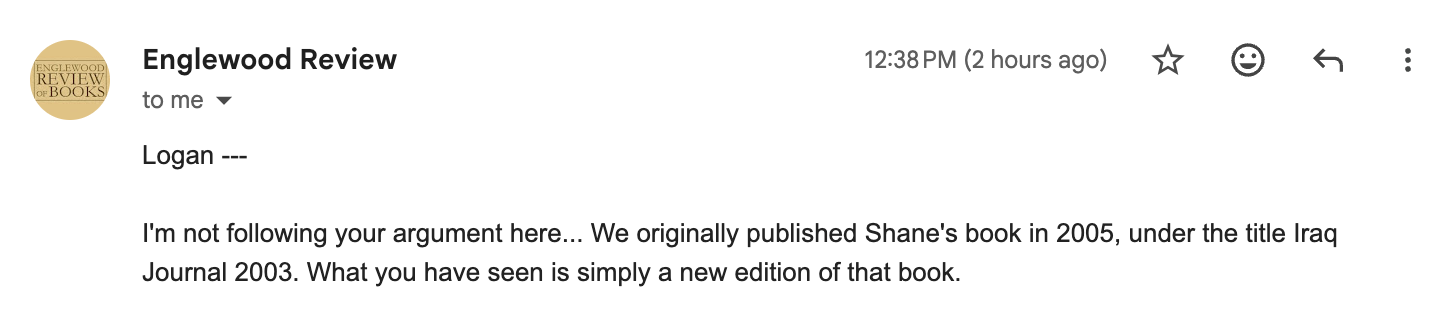 I'm not following your argument here... We originally published Shane's book in 2005, under the title Iraq Journal 2003. What you have seen is simply a new edition of that book.