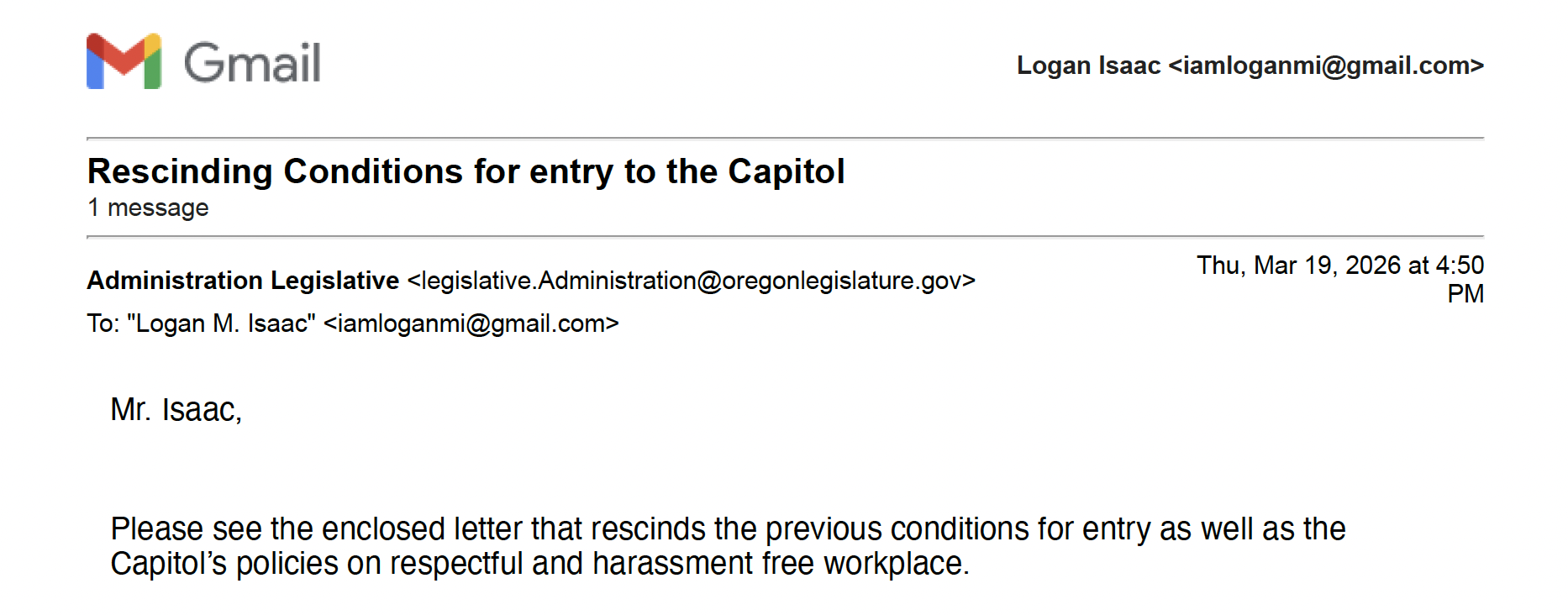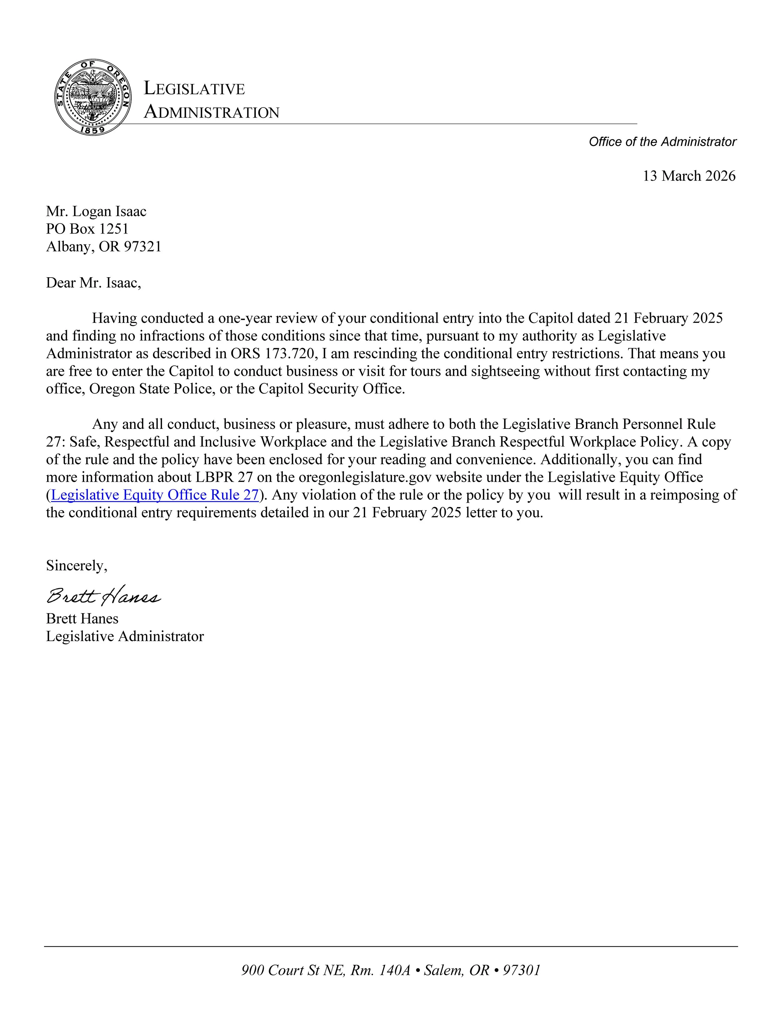 Having conducted a one-year review of your conditional entry into the Capitol dated 21 February 2025 and finding no infractions of those conditions since that time, pursuant to my authority as Legislative Administrator as described in ORS 173.720, I am rescinding the conditional entry restrictions. That means you are free to enter the Capitol to conduct business or visit for tours and sightseeing without first contacting my office, Oregon State Police, or the Capitol Security Office.