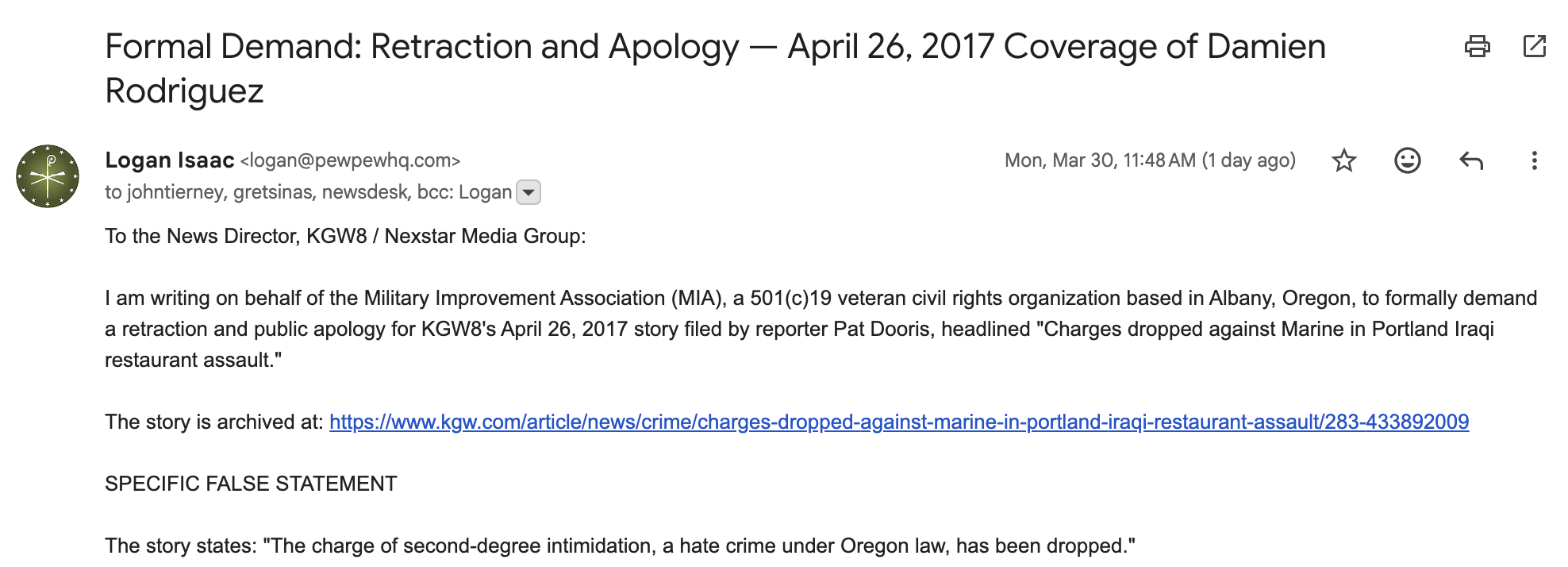 I am writing on behalf of the Military Improvement Association (MIA), a 501(c)19 veteran civil rights organization based in Albany, Oregon, to formally demand a retraction and public apology for KGW8's April 26, 2017 story filed by reporter Pat Dooris, headlined "Charges dropped against Marine in Portland Iraqi restaurant assault."